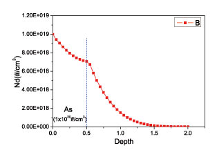 Another important feature of GSS-TechSim is its ability in solving diffusion equation where the diffusion constant is related to the carrier density in the substrate. For instance, in As doped n-type region, B ion diffuse slower than in intrinsic region. This would result in a kink of B doping profile in As stepped doping substrate. As demonstrated in Fig.3 and Fig.4.